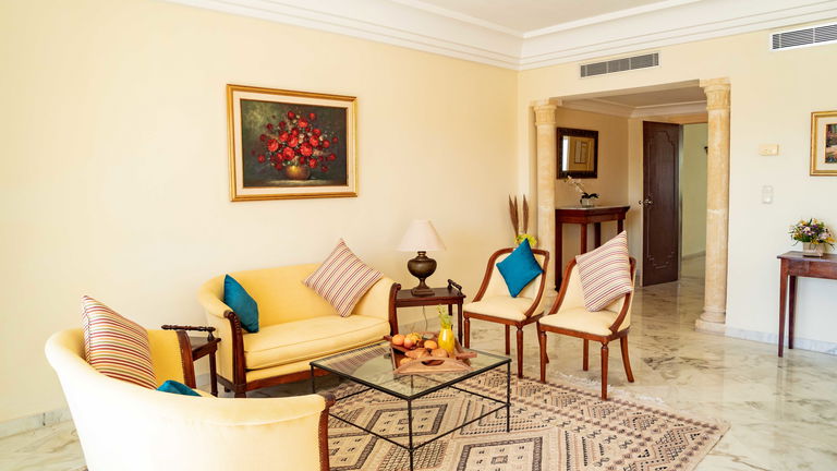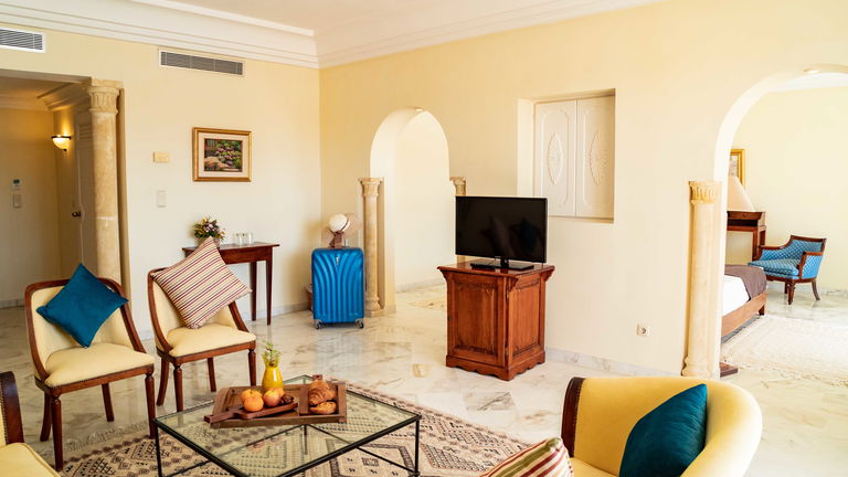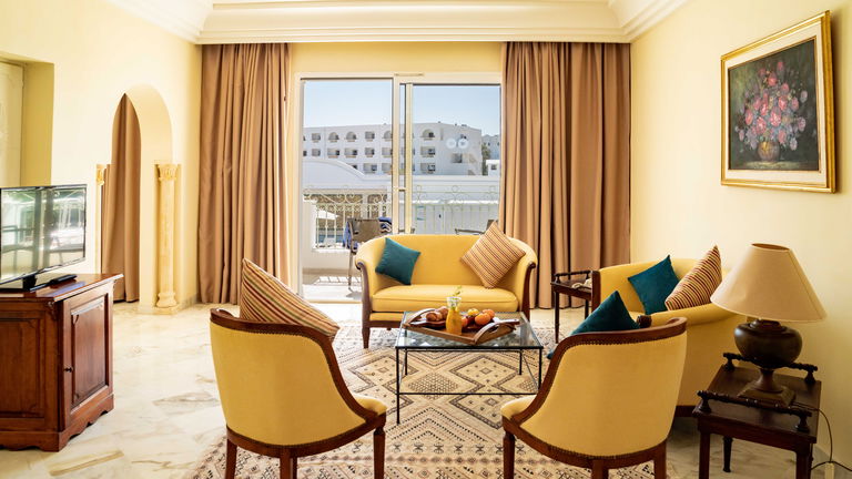 Our 40m² Suites offer a fantastic experience with pool views and all the great features of our standard double rooms. What makes them special is the separate living area, perfect for unwinding, having a good conversation, or just taking a moment to reflect on your day in Hammamet.